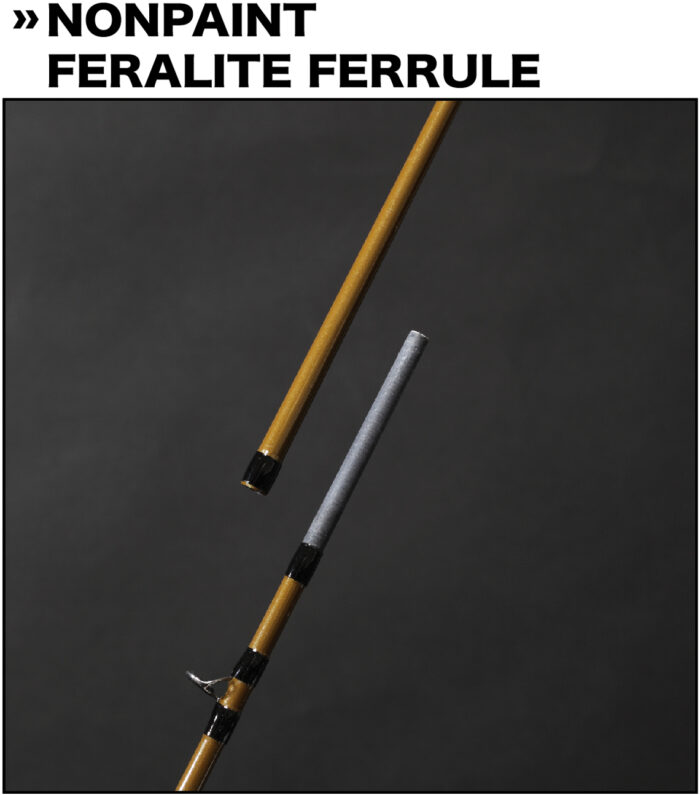 ジョイントはフェラライトフェルールタイプを採用。テーパーをデザインする上で同じカーブでもシャープなアクションになる効果やパワーロスの少なさなど、多くのメリットがあるからです。接合部分はあえてペイントを施さず、塗装膜厚による誤差を避けて精度を高めると同時ににブランク素材同士の食いつきの良さを利用したスムーズで確かな着脱感を実現しています。つなぎ合わせた時にノンペイント部分が若干見える余裕をもうけてあります。