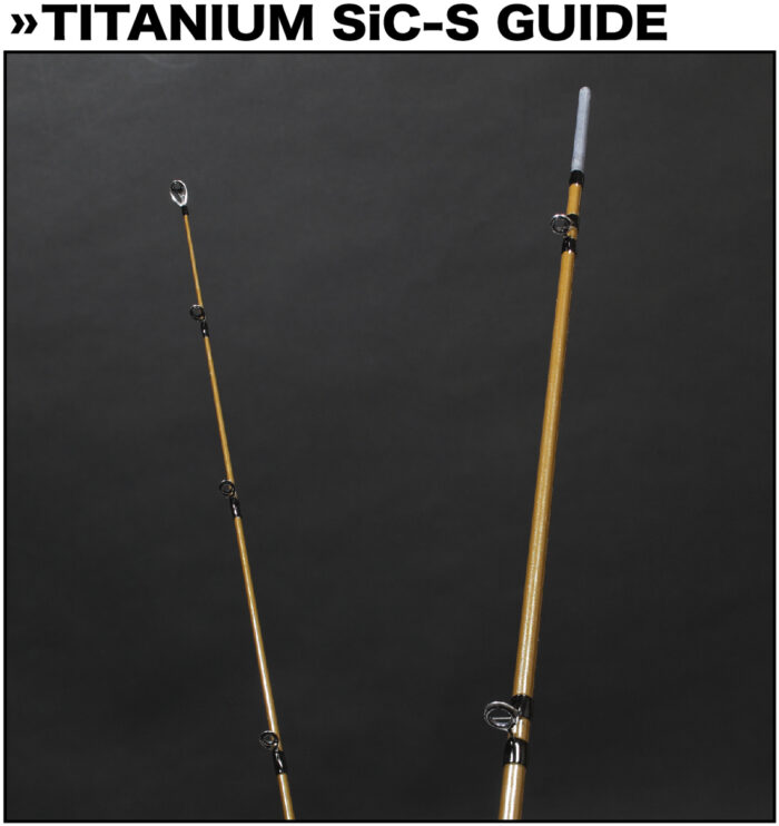 すべてのガイドにタフで軽量なチタンフレームSiCガイドを採用。強度の必要なトップガイド以外は軽量薄型のSiC-Sリング採用。バットセクションはアクションを妨げないショートダブルフットの超軽量なT-LRVSG、ミドル、ティップセクションはT-KBSGとT-KTSG、トップガイドにはT-KGSTをセッティング。チタンフレームならではの優れたバネ性でロッド本来のベンドを極力妨げずブレのないキャストと操作性を実現する最適なサイズがセットされた最新鋭の超軽量小口径ガイドセッティングです。バットガイドサイズ#8S、トップガイドサイズ#4.5J。