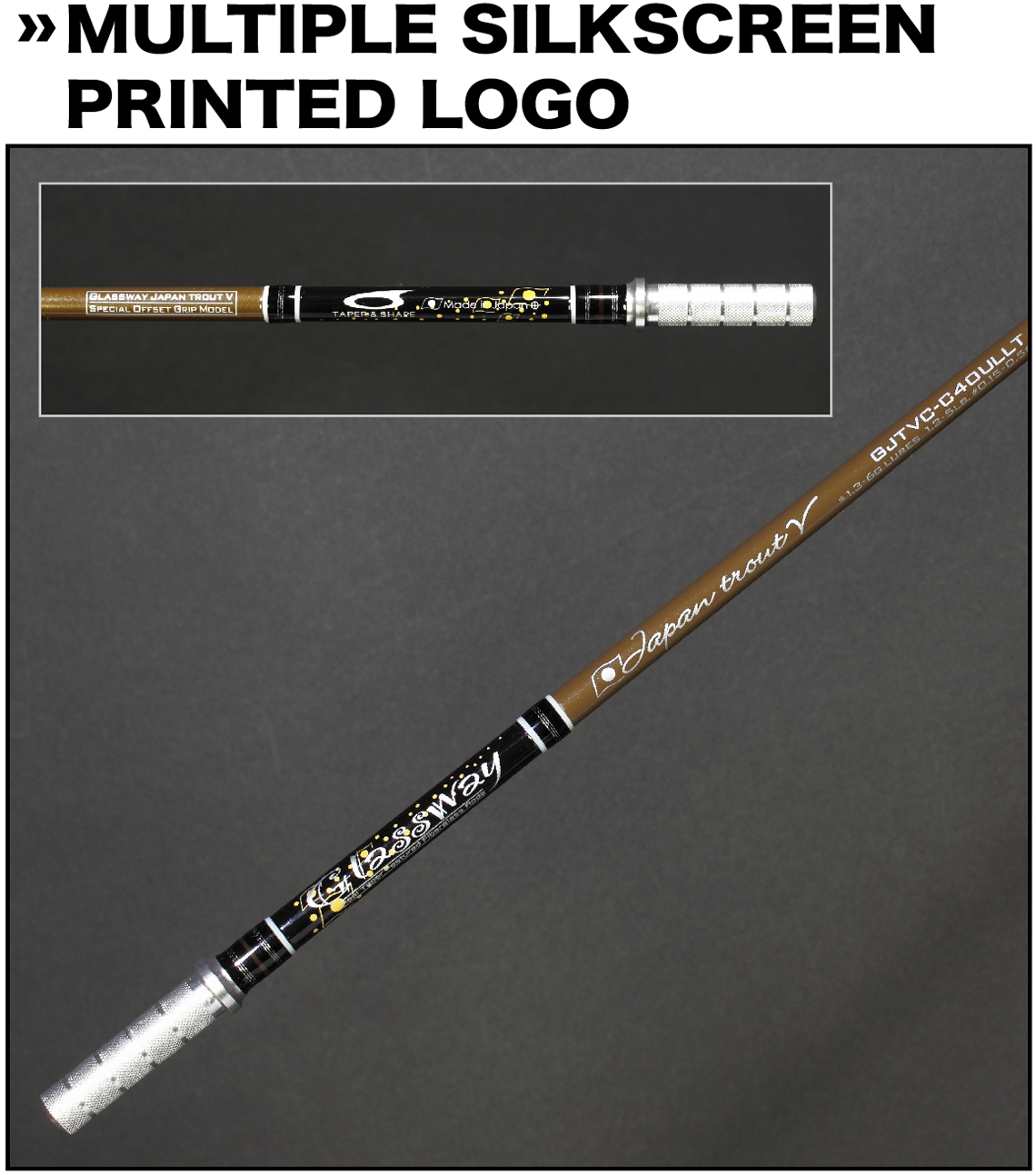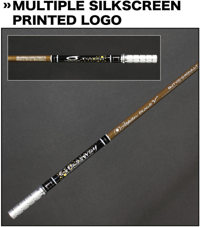 テーパーアンドシェイプロッドの新しいデザインアイコンとなったマルチシルクスクリーンプリントロゴ。ジャパントラウトV“スペシャルオフセットグリップモデル”は、ブラックをベースにジャパントラウトのイメージのライトベージュのアンダープリントが施されています。さらに“スペシャルオフセットグリップモデル”のアイコンとなるレクタングルデザインをプリントしたリミテッドモデル専用のシルクスクリーンプリントとなっています。
