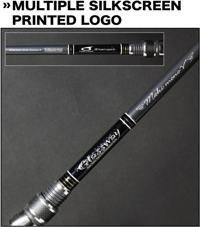 テーパーアンドシェイプロッドの新しいデザインアイコンとなったマルチシルクスクリーンプリントロゴ。マキ・モノV、V-SPには、ダークグレーメタリックのニューブランクカラーに、ガンメタルシルバーのインクでアンダープリントを施しました。その上にシルバーでグラスウェイのロゴとテーパーアンドシェイプロゴなどをプリントしています。精悍になった伝統のグレーカラーブランクとマッチするクールでスタイリッシュなデザインとなっています。反対サイドには「Valuable NODE System」とオーセンティックライン専用ロゴがプリントされています。