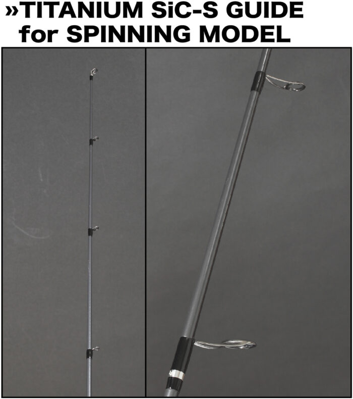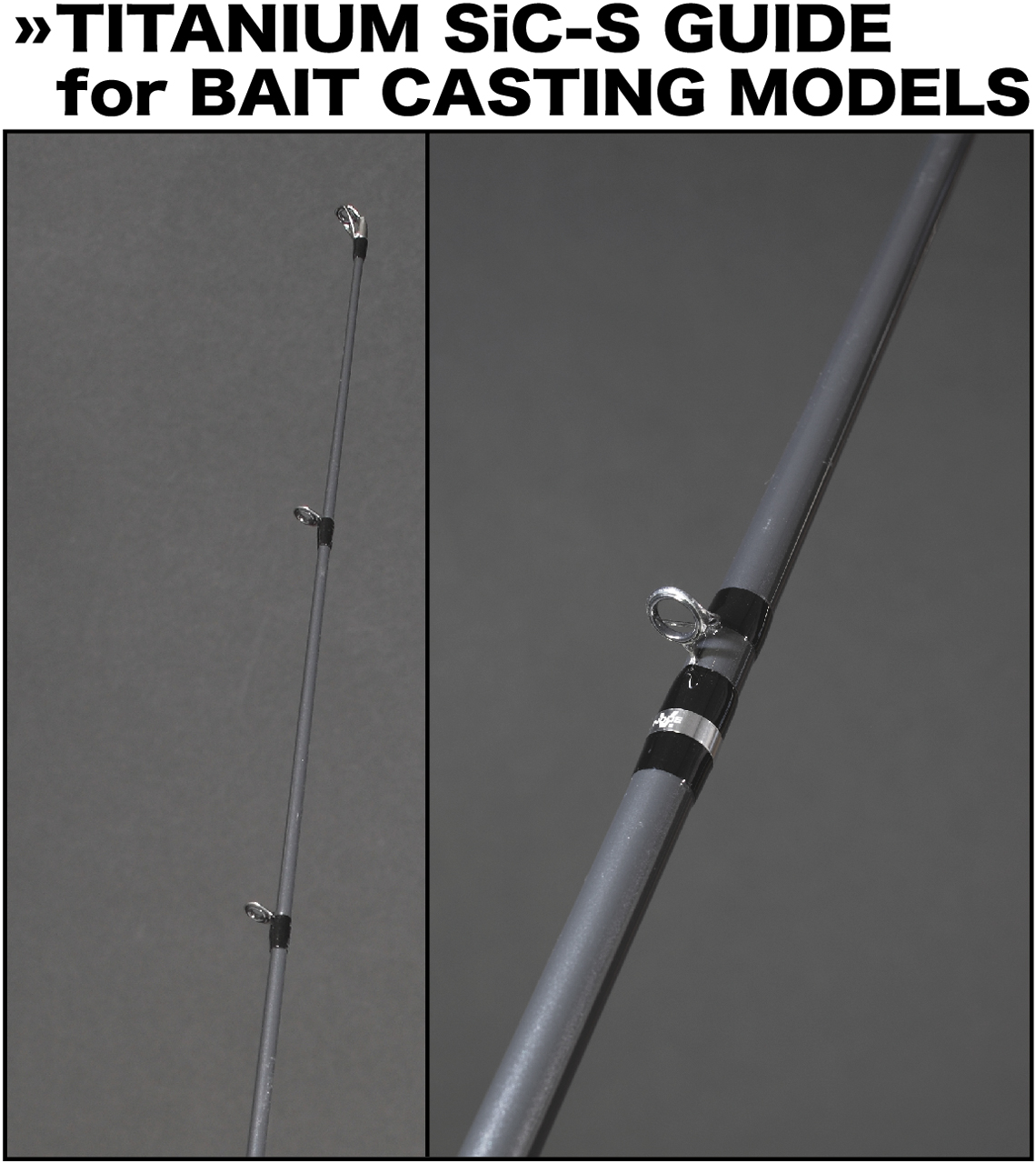 すべてのガイドにタフで軽量なチタンフレームSiCガイドを採用し、強度の必要なトップガイド以外は軽量薄型のSiC-Sリング採用。バットセクションはアクションを妨げないショートダブルフットの超軽量なT-LRVSG、ミドル、ティップセクションはT-KBSGとT-KTSG、トップガイドにはT-KGSTをセット。ロッド本来のベンドを極力妨げずブレのないキャストと優れた感度、飛距離を実現する最適数がセットされた最新鋭の超軽量小口径ガイドセッティングです。バットガイドサイズ#10S、トップガイドサイズ#4.5J。